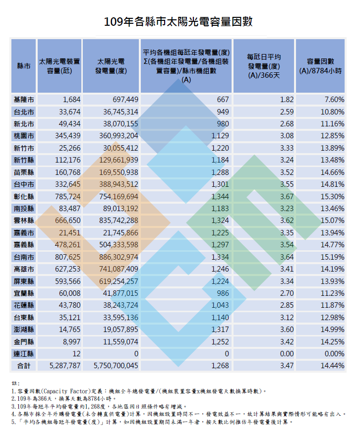 (圖:109年各縣市太陽光電容量因數/資料來源:台灣電力公司)
