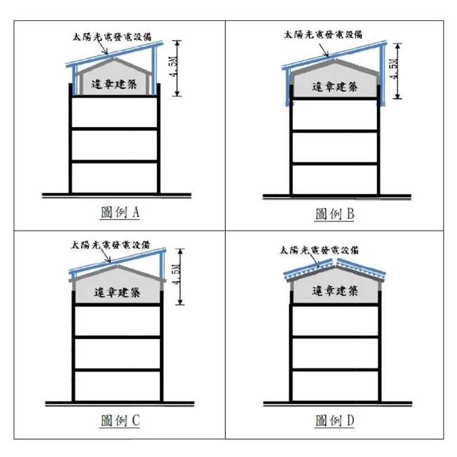 1、結構分例型:太陽光電設備(含支撐架)與違章建築結構分立(如圖例A及B)。