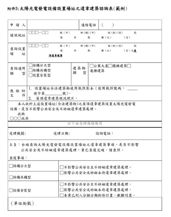 排除以上三點情況後,填寫違章建築諮詢表(表格下載),並附上使用執照和現場照片,向所在地的建築主管機關確認其是否影響公共安全。
